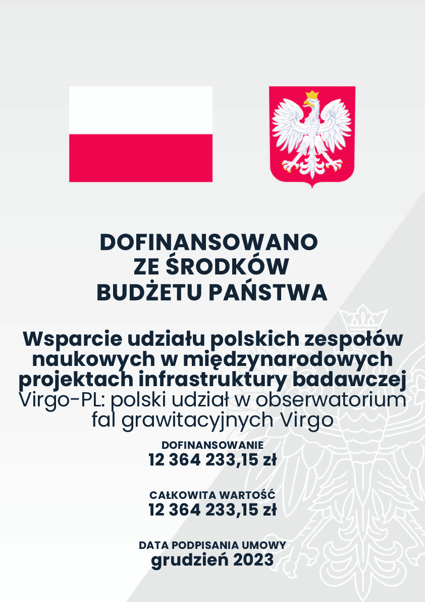 Projekt „Virgo-PL: polski udział w obserwatorium fal grawitacyjnych Virgo” został zaakceptowany do finansowania w ramach programu „Wsparcie udziału polskich zespołów naukowych w międzynarodowych projektach infrastruktury badawczej” Ministerstwa Edukacji i Nauki.